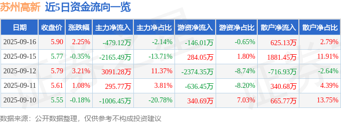 证券之星消息,截至2025年9月16日收盘,苏州高新(600736)报收于5.9元,上涨2.25%,换手率3.32%,成交量38.19万手,成交额2.24亿元。