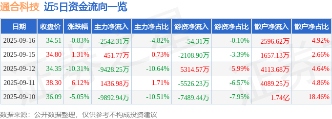 证券之星消息,截至2025年9月16日收盘,通合科技(300491)报收于34.51元,下跌0.83%,换手率9.91%,成交量15.42万手,成交额5.27亿元。