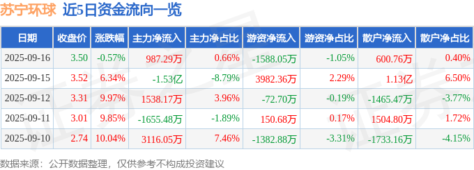 证券之星消息,截至2025年9月16日收盘,苏宁环球(000718)报收于3.5元,下跌0.57%,换手率18.78%,成交量428.62万手,成交额15.06亿元。