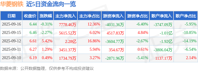 证券之星消息,截至2025年9月16日收盘,华菱钢铁(000932)报收于6.44元,下跌0.31%,换手率1.43%,成交量98.57万手,成交额6.29亿元。