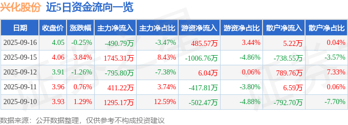 证券之星消息,截至2025年9月16日收盘,兴化股份(002109)报收于4.05元,下跌0.25%,换手率2.77%,成交量35.31万手,成交额1.41亿元。