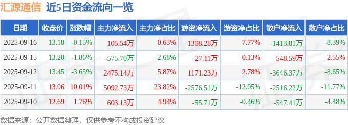 证券之星消息,截至2025年9月16日收盘,汇源通信(000586)报收于13.18元,下跌0.15%,换手率6.64%,成交量12.84万手,成交额1.68亿元。