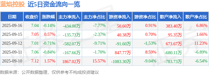 证券之星消息,截至2025年9月16日收盘,蓝焰控股(000968)报收于7.04元,下跌0.14%,换手率0.82%,成交量7.94万手,成交额5585.67万元。