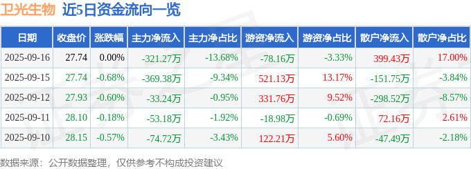 证券之星消息,截至2025年9月16日收盘,卫光生物(002880)报收于27.74元,上涨0.0%,换手率0.38%,成交量8503.0手,成交额2349.0万元。