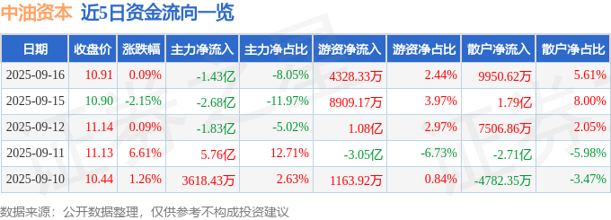证券之星消息,截至2025年9月16日收盘,中油资本(000617)报收于10.91元,上涨0.09%,换手率1.29%,成交量163.33万手,成交额17.74亿元。