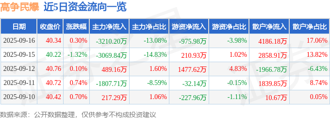 证券之星消息,截至2025年9月16日收盘,高争民爆(002827)报收于40.34元,上涨0.3%,换手率2.22%,成交量6.13万手,成交额2.45亿元。