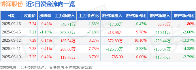证券之星消息,截至2025年9月16日收盘,博深股份(002282)报收于7.24元,上涨0.42%,换手率1.0%,成交量5.07万手,成交额3658.93万元。