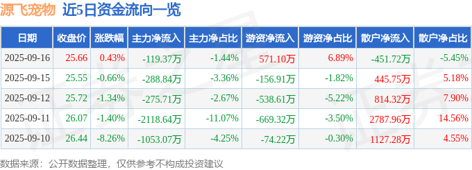 证券之星消息,截至2025年9月16日收盘,源飞宠物(001222)报收于25.66元,上涨0.43%,换手率2.97%,成交量3.25万手,成交额8288.64万元。