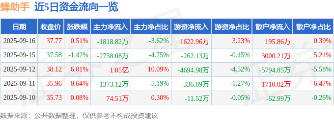证券之星消息,截至2025年9月16日收盘,蜂助手(301382)报收于37.77元,上涨0.51%,换手率7.52%,成交量13.31万手,成交额5.02亿元。