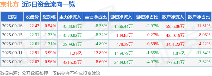 证券之星消息,截至2025年9月16日收盘,京北方(002987)报收于22.43元,上涨0.54%,换手率2.82%,成交量23.76万手,成交额5.27亿元。