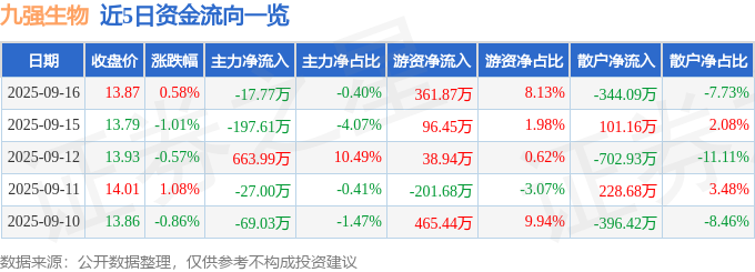 9月16日的资金流向数据方面,主力资金净流出17.77万元,占总成交额0.4%,游资资金净流入361.87万元,占总成交额8.13%,散户资金净流出344.09万元,占总成交额7.73%。