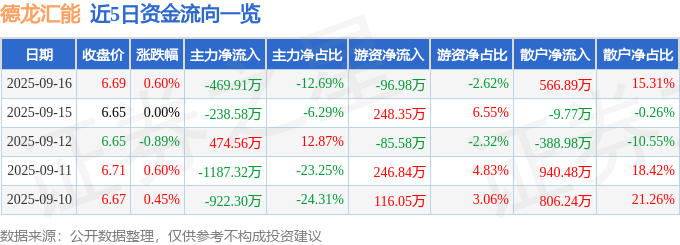 证券之星消息,截至2025年9月16日收盘,德龙汇能(000593)报收于6.69元,上涨0.6%,换手率1.55%,成交量5.55万手,成交额3702.24万元。