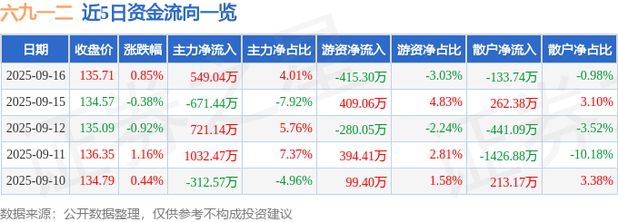 证券之星消息,截至2025年9月16日收盘,六九一二(301592)报收于135.71元,上涨0.85%,换手率5.82%,成交量1.02万手,成交额1.37亿元。