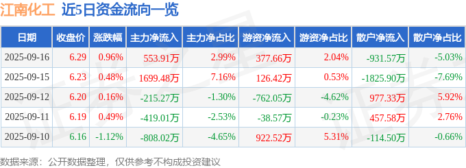 证券之星消息,截至2025年9月16日收盘,江南化工(002226)报收于6.29元,上涨0.96%,换手率1.12%,成交量29.61万手,成交额1.85亿元。