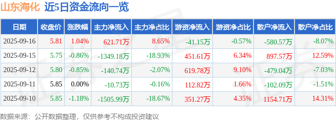 证券之星消息,截至2025年9月16日收盘,山东海化(000822)报收于5.81元,上涨1.04%,换手率1.39%,成交量12.43万手,成交额7190.35万元。