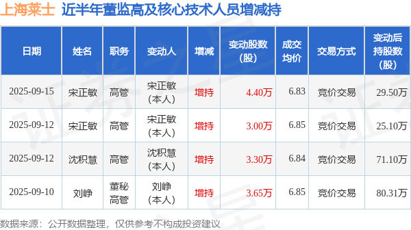 上海莱士近半年内的董监高及核心技术人员增减持详情如下: