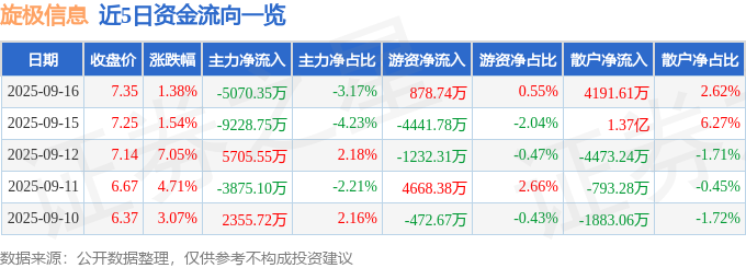 证券之星消息,截至2025年9月16日收盘,旋极信息(300324)报收于7.35元,上涨1.38%,换手率12.77%,成交量218.45万手,成交额16.01亿元。