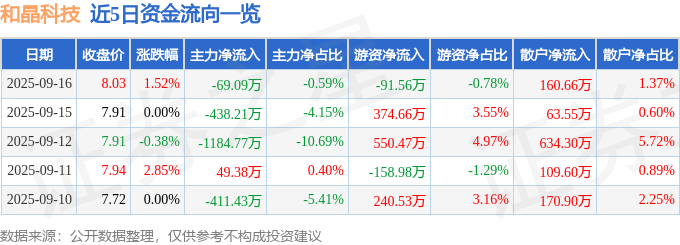 证券之星消息,截至2025年9月16日收盘,和晶科技(300279)报收于8.03元,上涨1.52%,换手率3.18%,成交量14.72万手,成交额1.17亿元。