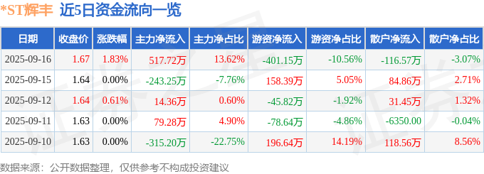 证券之星消息,截至2025年9月16日收盘,*ST辉丰(002496)报收于1.67元,上涨1.83%,换手率2.07%,成交量23.01万手,成交额3800.41万元。