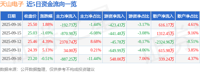 证券之星消息,截至2025年9月16日收盘,天山电子(301379)报收于25.5元,上涨1.88%,换手率4.21%,成交量5.34万手,成交额1.34亿元。