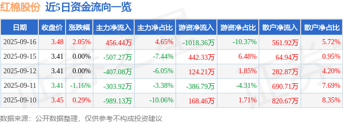 证券之星消息,截至2025年9月16日收盘,红棉股份(000523)报收于3.48元,上涨2.05%,换手率2.15%,成交量28.49万手,成交额9819.8万元。