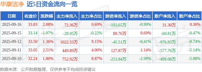 证券之星消息,截至2025年9月16日收盘,华康洁净(301235)报收于33.83元,上涨2.08%,换手率4.26%,成交量3.1万手,成交额1.04亿元。