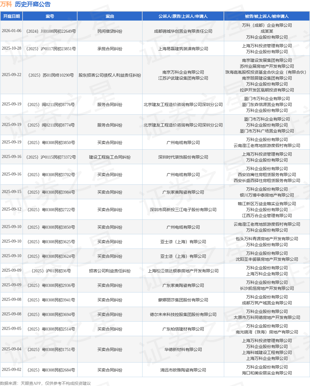 案号:(2025)粤0308民初3850号根据统计,近一年内以万科企业股份有限公司为当事人的历史开庭公告有359则,其中案由为“买卖合同纠纷”的公告以219则居首,其次为“建设工程施工合同纠纷”有28则,“服务合同纠纷”有16则。历史开庭公告(前20条)如下: