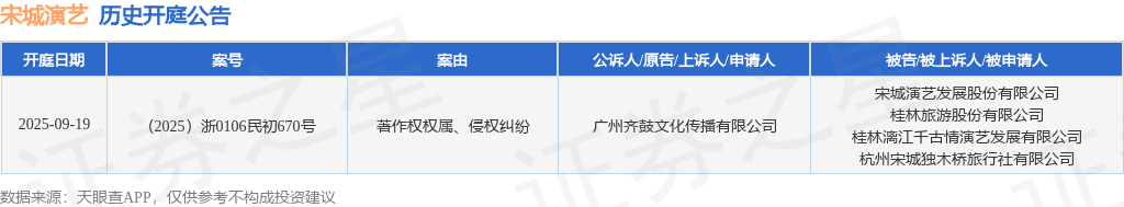 根据统计,近一年内以宋城演艺发展股份有限公司为当事人的历史开庭公告有1则,其中案由为“著作权权属、侵权纠纷”的公告以1则居首。历史开庭公告如下:
