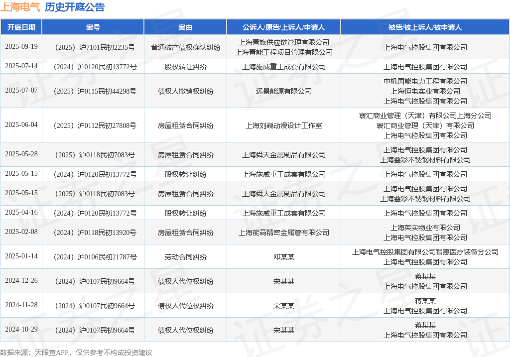 案号:(2025)沪7101民初2235号根据统计,近一年内以上海电气控股集团有限公司为当事人的历史开庭公告有13则,其中案由为“房屋租赁合同纠纷”的公告以4则居首,其次为“债权人代位权纠纷”有3则,“股权转让纠纷”有3则。历史开庭公告如下: