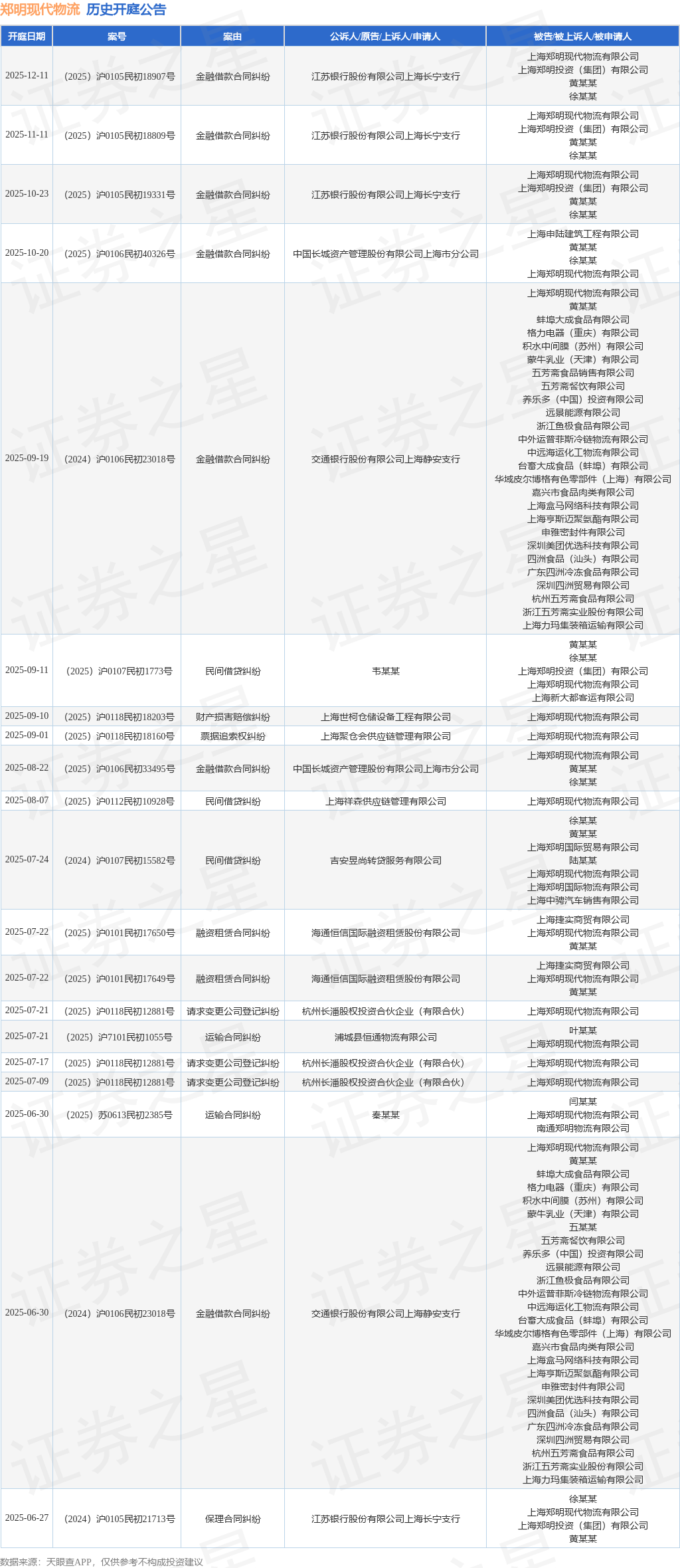 根据统计,近一年内以上海郑明现代物流有限公司为当事人的历史开庭公告有113则,其中案由为“金融借款合同纠纷”的公告以51则居首,其次为“劳动合同纠纷”有13则,“融资租赁合同纠纷”有5则。历史开庭公告(前20条)如下: