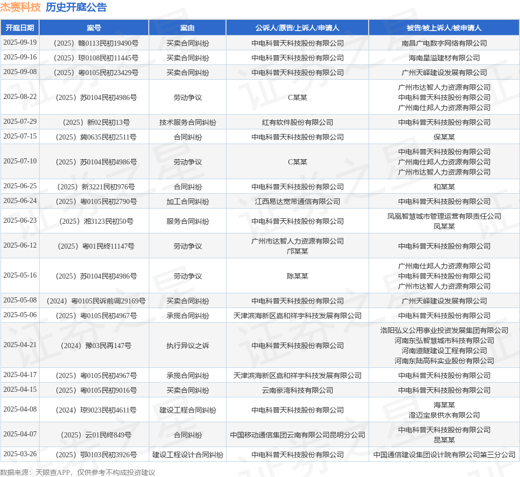 案号:(2025)赣0113民初19490号根据统计,近一年内以中电科普天科技股份有限公司为当事人的历史开庭公告有37则,其中案由为“买卖合同纠纷”的公告以13则居首,其次为“劳动争议”有5则,“合同纠纷”有5则。历史开庭公告(前20条)如下: