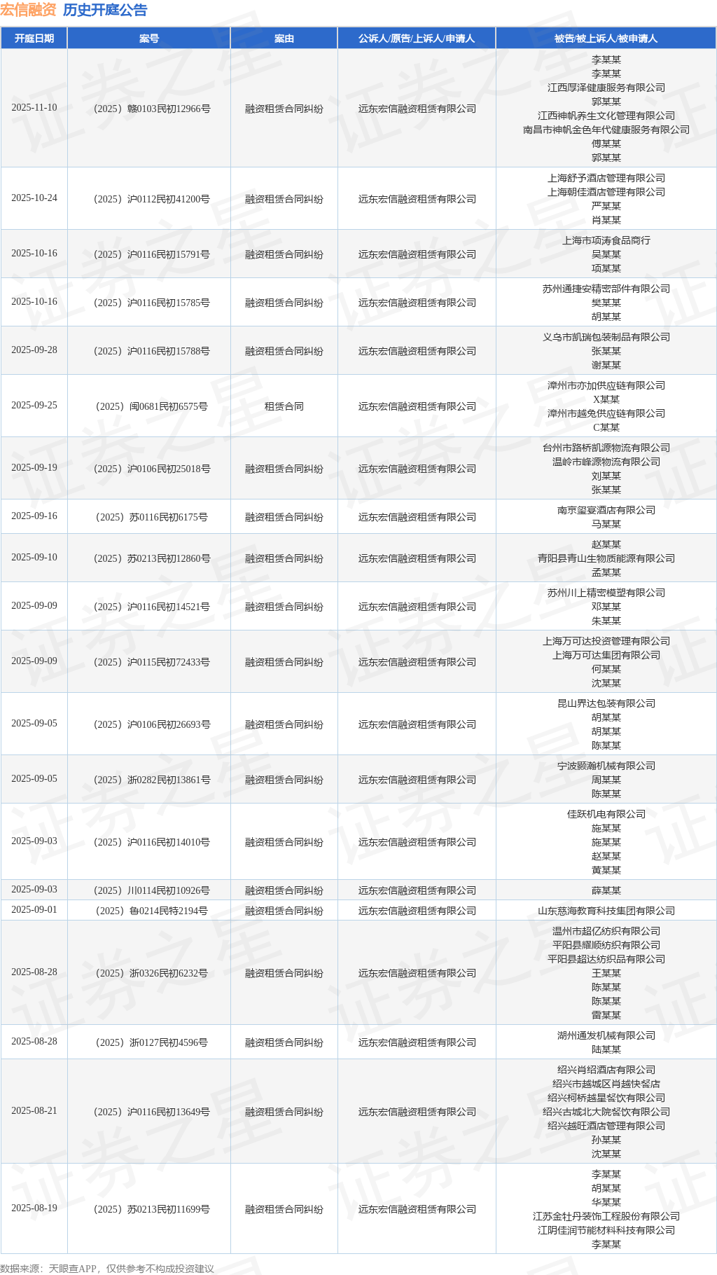 根据统计,近一年内以远东宏信融资租赁有限公司为当事人的历史开庭公告有83则,其中案由为“融资租赁合同纠纷”的公告以81则居首,其次为“租赁合同”有2则。历史开庭公告(前20条)如下:
