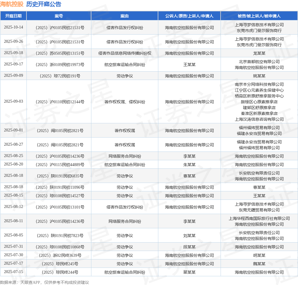 案号:(2025)苏0505民初13151号根据统计,近一年内以海南航空控股股份有限公司为当事人的历史开庭公告有76则,其中案由为“劳动争议”的公告以37则居首,其次为“航空旅客运输合同纠纷”有12则,“劳动合同纠纷”有4则。历史开庭公告(前20条)如下: