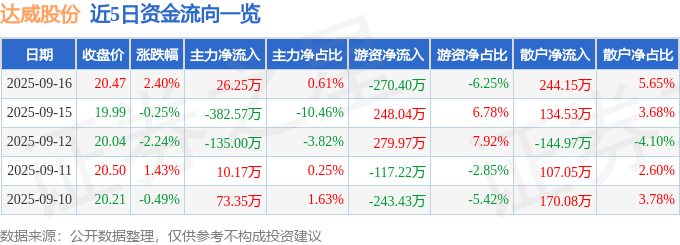 证券之星消息,截至2025年9月16日收盘,达威股份(300535)报收于20.47元,上涨2.4%,换手率2.81%,成交量2.14万手,成交额4323.5万元。