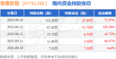 证券之星消息,9月16日南向资金增持47.9万股晋景新能(01783.HK)。近5个交易日中,获南向资金增持的有5天,累计净增持115.3万股。截至目前,南向资金持有晋景新能(01783.HK)115.3万股,占公司已发行普通股的0.08%。
