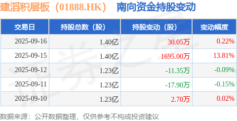 证券之星消息,9月16日南向资金增持30.05万股建滔积层板(01888.HK)。近5个交易日中,获南向资金增持的有3天,累计净增持1698.5万股。近20个交易日中,获南向资金增持的有12天,累计净增持4229.2万股。截至目前,南向资金持有建滔积层板(01888.HK)1.4亿股,占公司已发行普通股的4.48%。