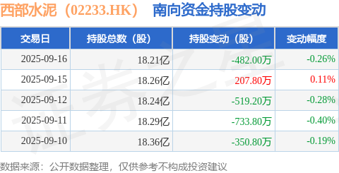 证券之星消息,9月16日南向资金减持482.0万股西部水泥(02233.HK)。近5个交易日中,获南向资金减持的有4天,累计净减持1878.0万股。近20个交易日中,获南向资金增持的有11天,累计净增持6344.2万股。截至目前,南向资金持有西部水泥(02233.HK)18.21亿股,占公司已发行普通股的33.33%。