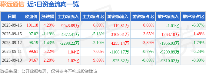 证券之星消息,截至2025年9月16日收盘,移远通信(603236)报收于101.18元,上涨4.29%,换手率5.51%,成交量14.42万手,成交额14.43亿元。