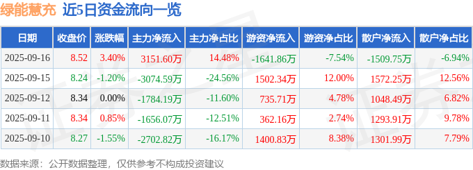 证券之星消息,截至2025年9月16日收盘,绿能慧充(600212)报收于8.52元,上涨3.4%,换手率4.99%,成交量25.71万手,成交额2.18亿元。
