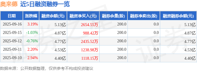 奥来德融资融券信息显示,融资方面,当日融资买入6272.81万元,融资偿还3618.27万元,融资净买入2654.55万元,连续3日净买入累计6078.49万元。融券方面,融券卖出0.0股,融券偿还0.0股,融券余量200.0股,融券余额0.54万元。融资融券余额5.13亿元。