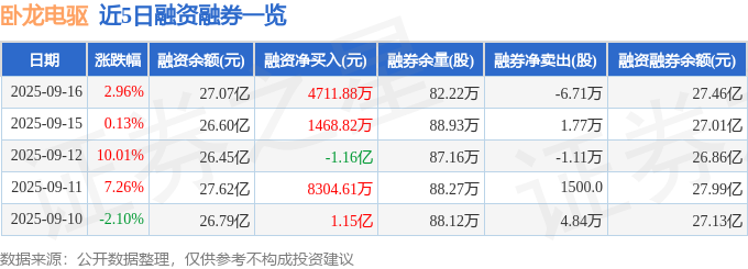 卧龙电驱融资融券信息显示,融资方面,当日融资买入10.47亿元,融资偿还10.0亿元,融资净买入4711.88万元。融券方面,融券卖出1.54万股,融券偿还8.25万股,融券余量82.22万股,融券余额3912.19万元。融资融券余额27.46亿元。