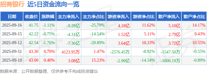 证券之星消息,截至2025年9月16日收盘,招商银行(600036)报收于41.75元,下跌1.11%,换手率0.42%,成交量85.91万手,成交额36.0亿元。