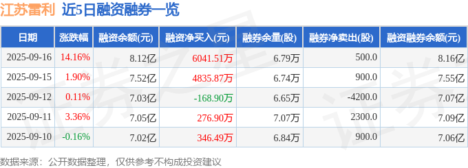 江苏雷利融资融券信息显示,融资方面,当日融资买入3.9亿元,融资偿还3.3亿元,融资净买入6041.51万元。融券方面,融券卖出500.0股,融券偿还0.0股,融券余量6.79万股,融券余额420.66万元。融资融券余额8.16亿元。