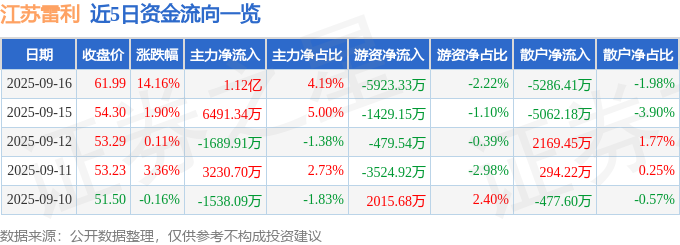 证券之星消息,截至2025年9月16日收盘,江苏雷利(300660)报收于61.99元,上涨14.16%,换手率10.18%,成交量45.49万手,成交额26.73亿元。