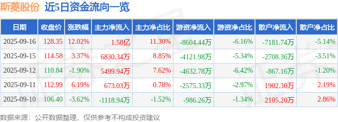 证券之星消息,截至2025年9月16日收盘,斯菱股份(301550)报收于128.35元,上涨12.02%,换手率11.73%,成交量11.43万手,成交额13.97亿元。