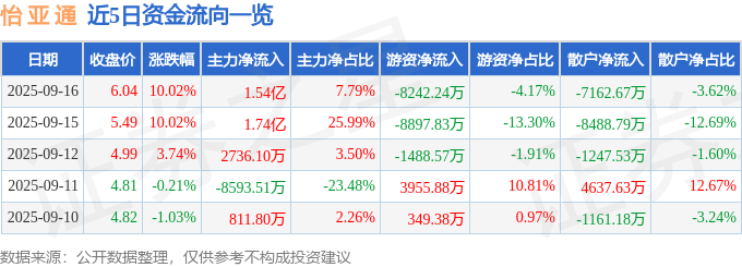 证券之星消息,截至2025年9月16日收盘,怡 亚 通(002183)报收于6.04元,上涨10.02%,已连续涨停2天,换手率13.11%,成交量340.59万手,成交额19.79亿元。