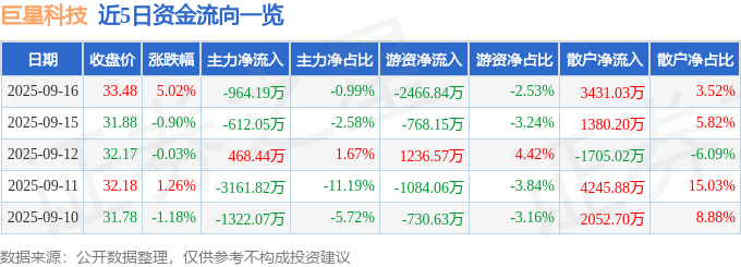 证券之星消息,截至2025年9月16日收盘,巨星科技(002444)报收于33.48元,上涨5.02%,换手率2.56%,成交量29.31万手,成交额9.74亿元。