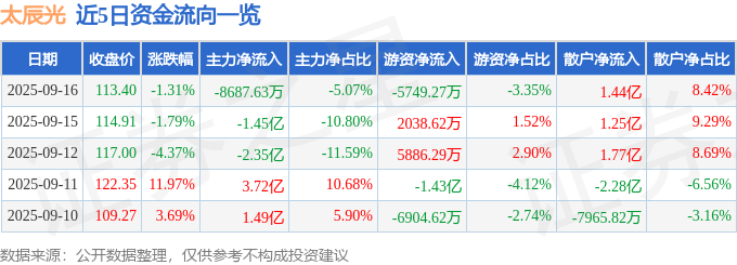 证券之星消息,截至2025年9月16日收盘,太辰光(300570)报收于113.4元,下跌1.31%,换手率7.9%,成交量15.19万手,成交额17.15亿元。