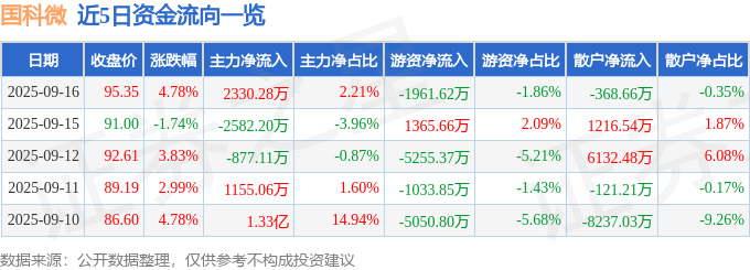 证券之星消息,截至2025年9月16日收盘,国科微(300672)报收于95.35元,上涨4.78%,换手率5.38%,成交量11.31万手,成交额10.53亿元。