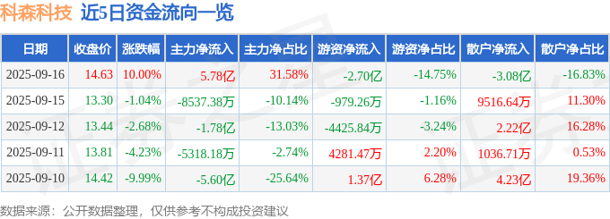 9月16日的资金流向数据方面,主力资金净流入5.78亿元,占总成交额31.58%,游资资金净流出2.7亿元,占总成交额14.75%,散户资金净流出3.08亿元,占总成交额16.83%。